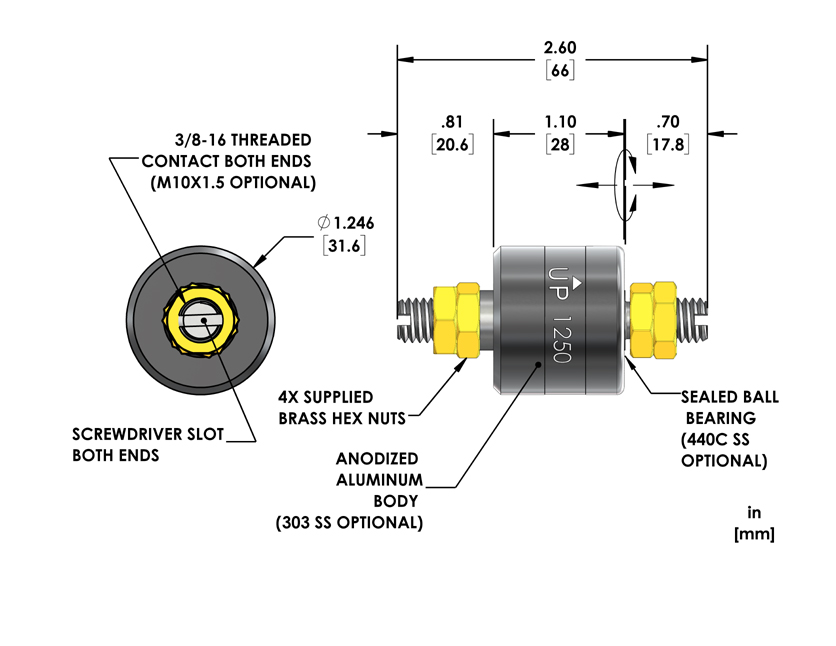| 1250 | 1 | Anodized Aluminum | Chrome Steel | Seal | 3/8 – 16 | 250 | 1 | N/A | 250 | 1200 | Min -20 (-29) Max 140 (60) |