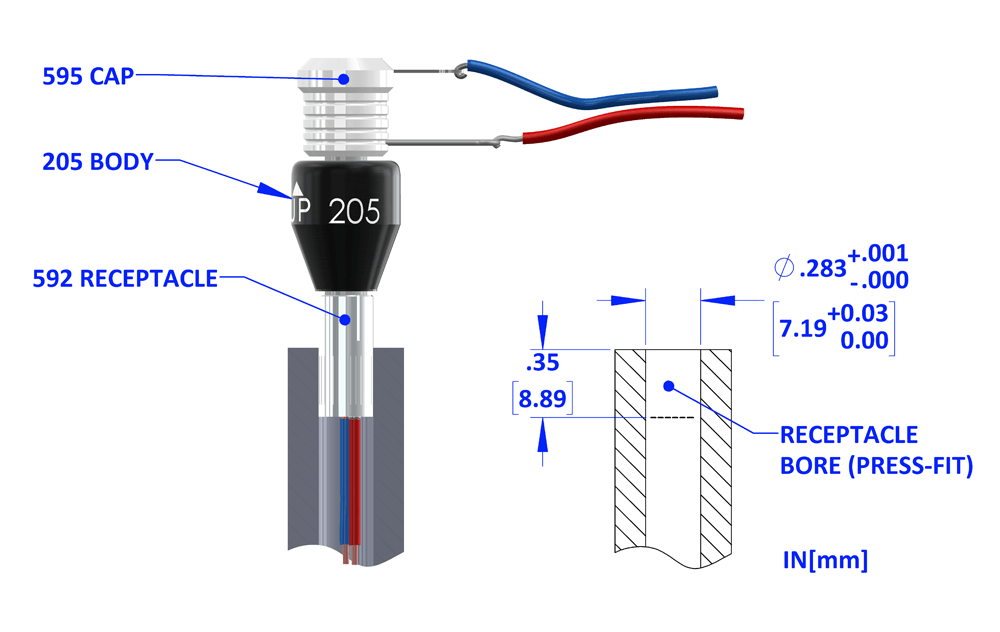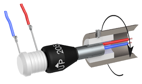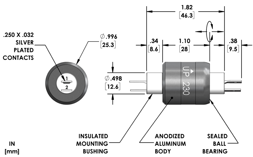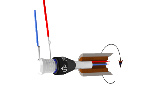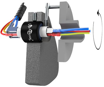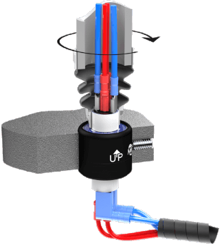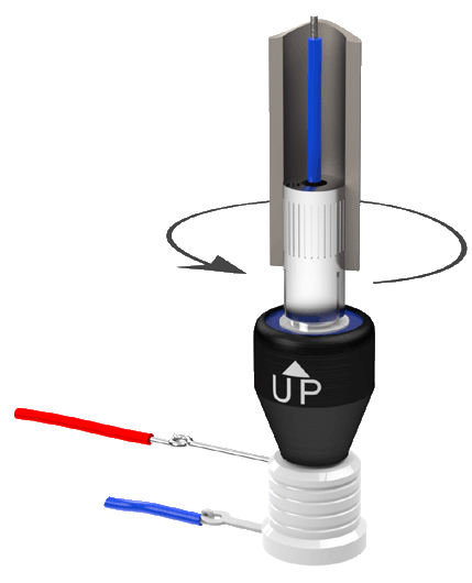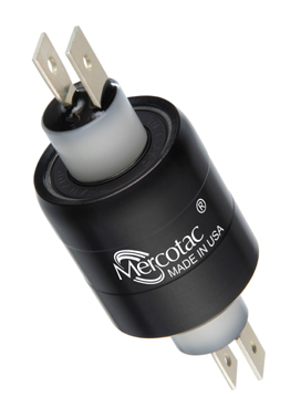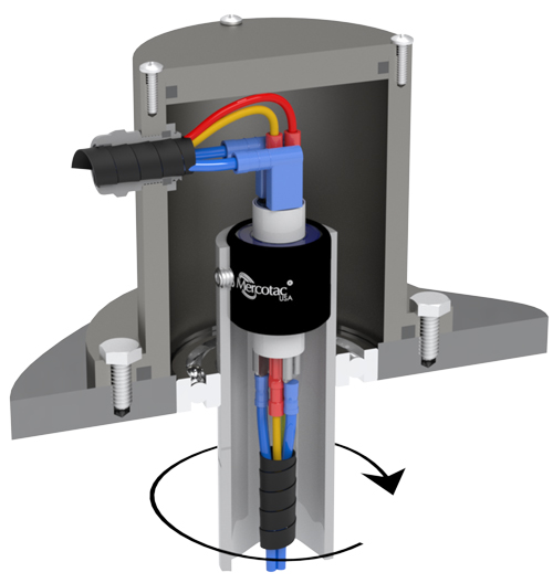 Model 205 is typically mounted by either the black body or the contact. Body mount typically uses a set screw or split clamp. Contact mount is held in the installed receptacle by a spring fit. It is best to mount the Mercotac so the body of the connector rotates. When used horizontally, mount the Mercotac so the body of the connector rotates.