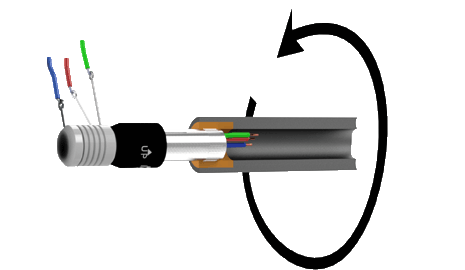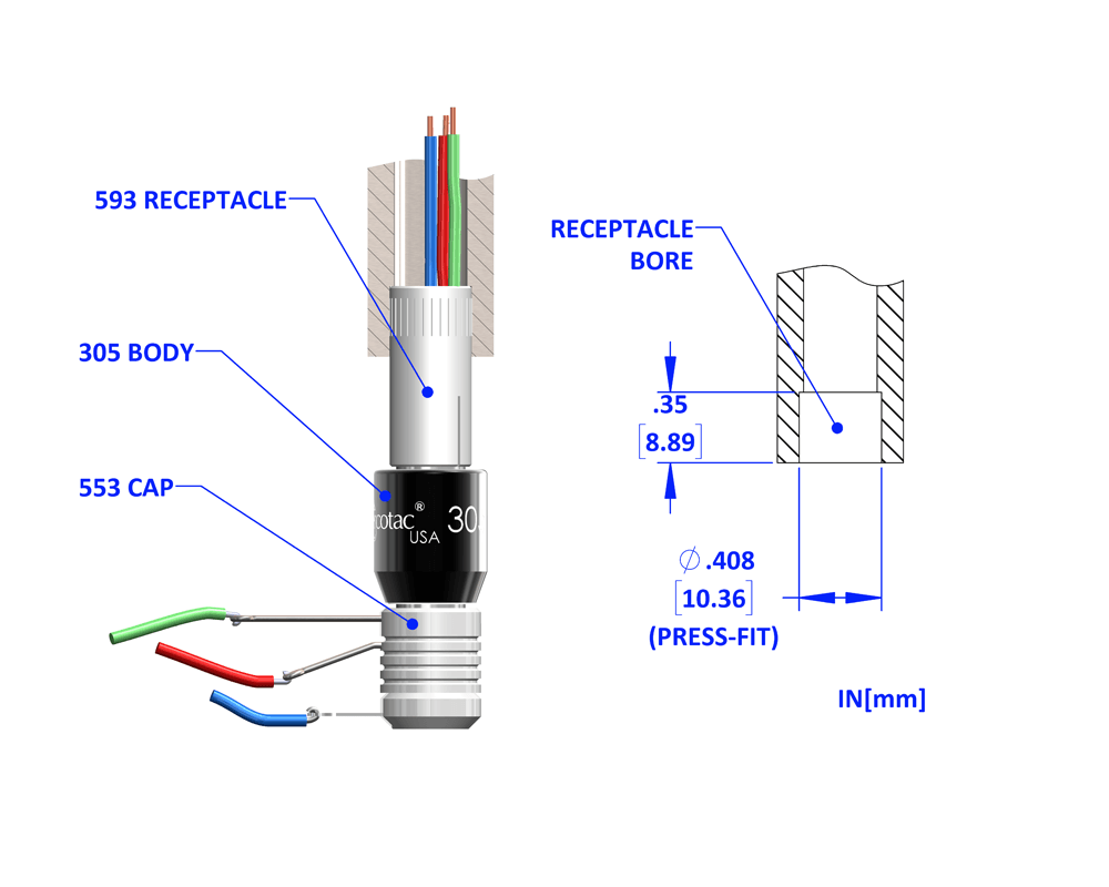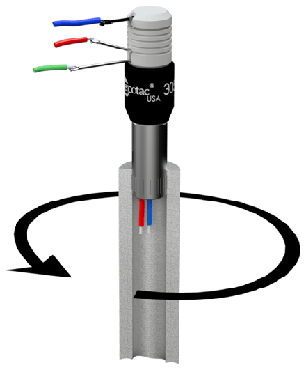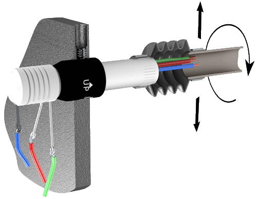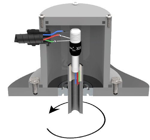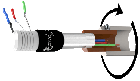 Model 305 is typically mounted by the knurled metal receptacle, which is press-fit into the rotating member of the machine. When used horizontally, mount the Mercotac so the body of the connector rotates.