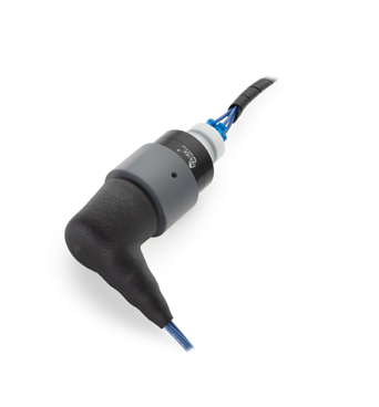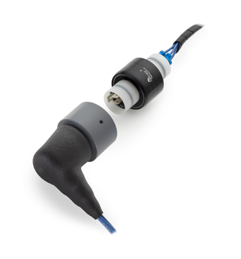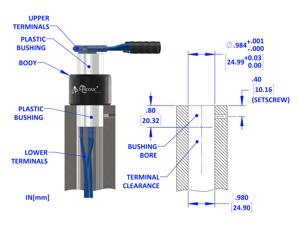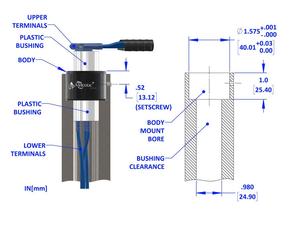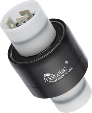 Model 335 is typically mounted by either the black body or the white plastic bushing on either end using a set screw or split clamp. When used horizontally, mount the Mercotac so the body of the connector rotates